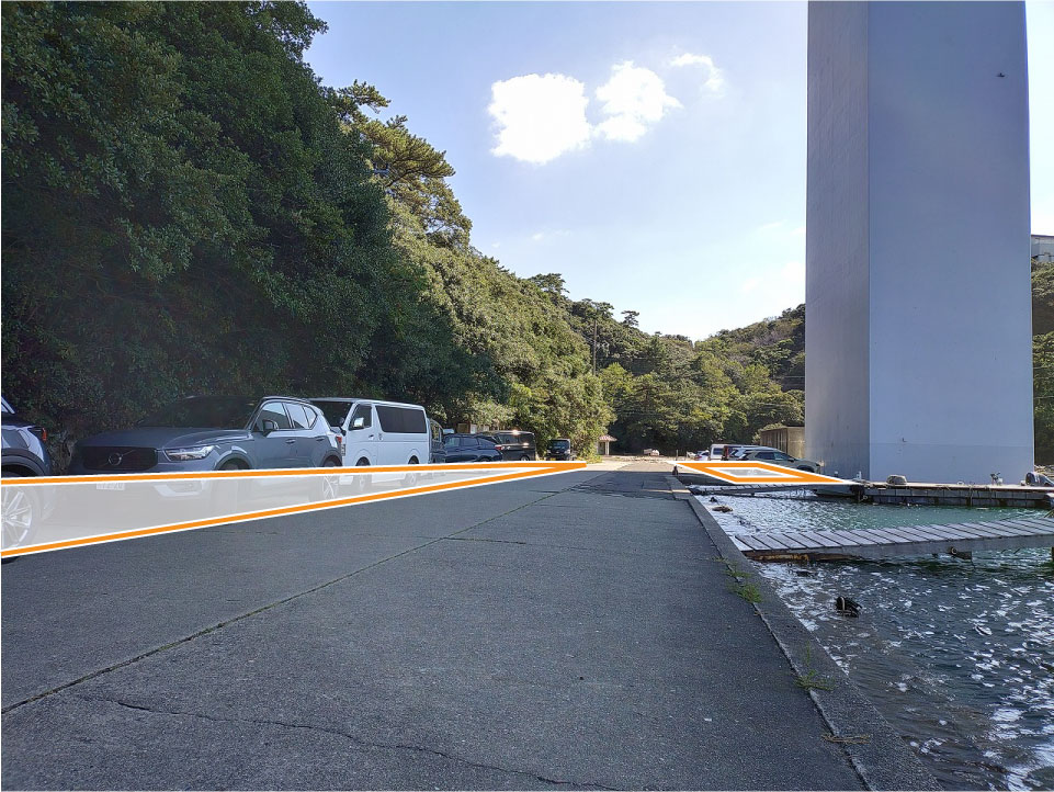 オレンジの線内は駐車OK、橋脚の下も駐車OK。